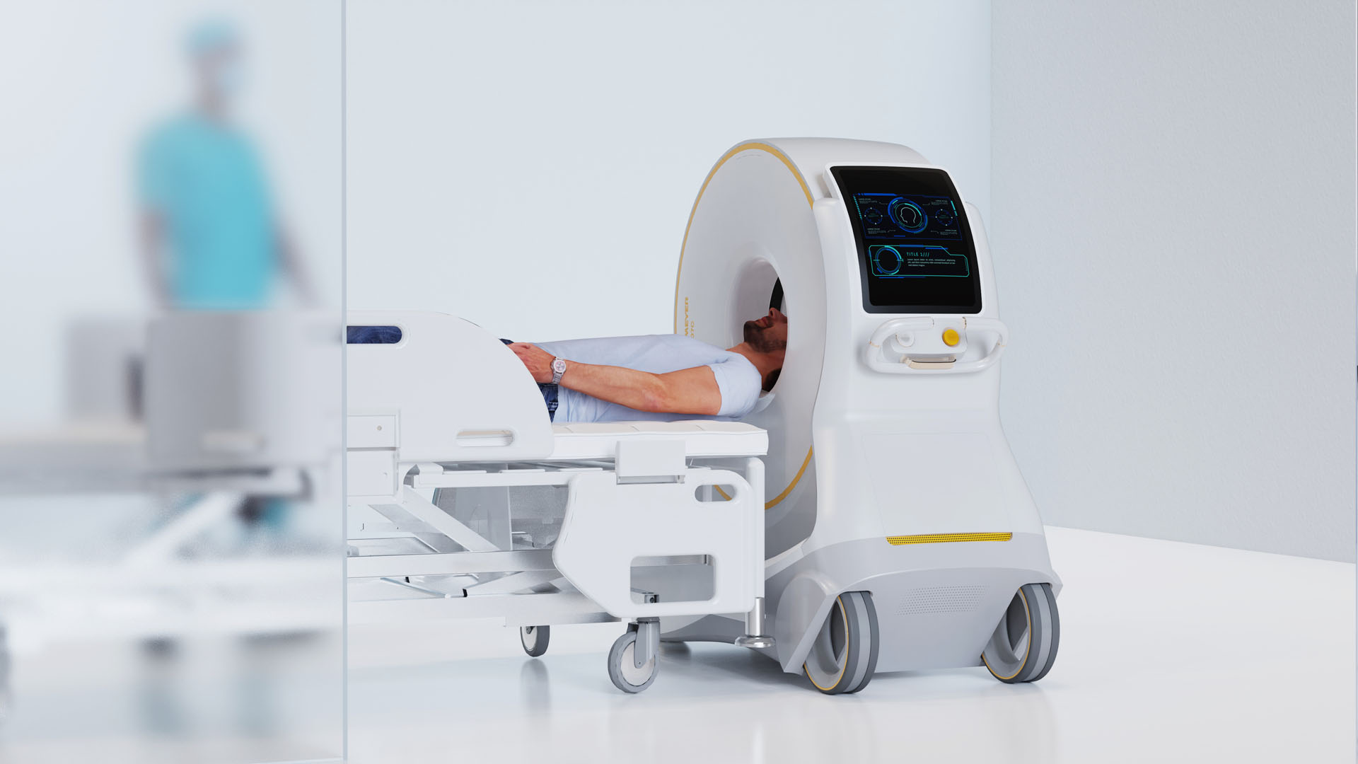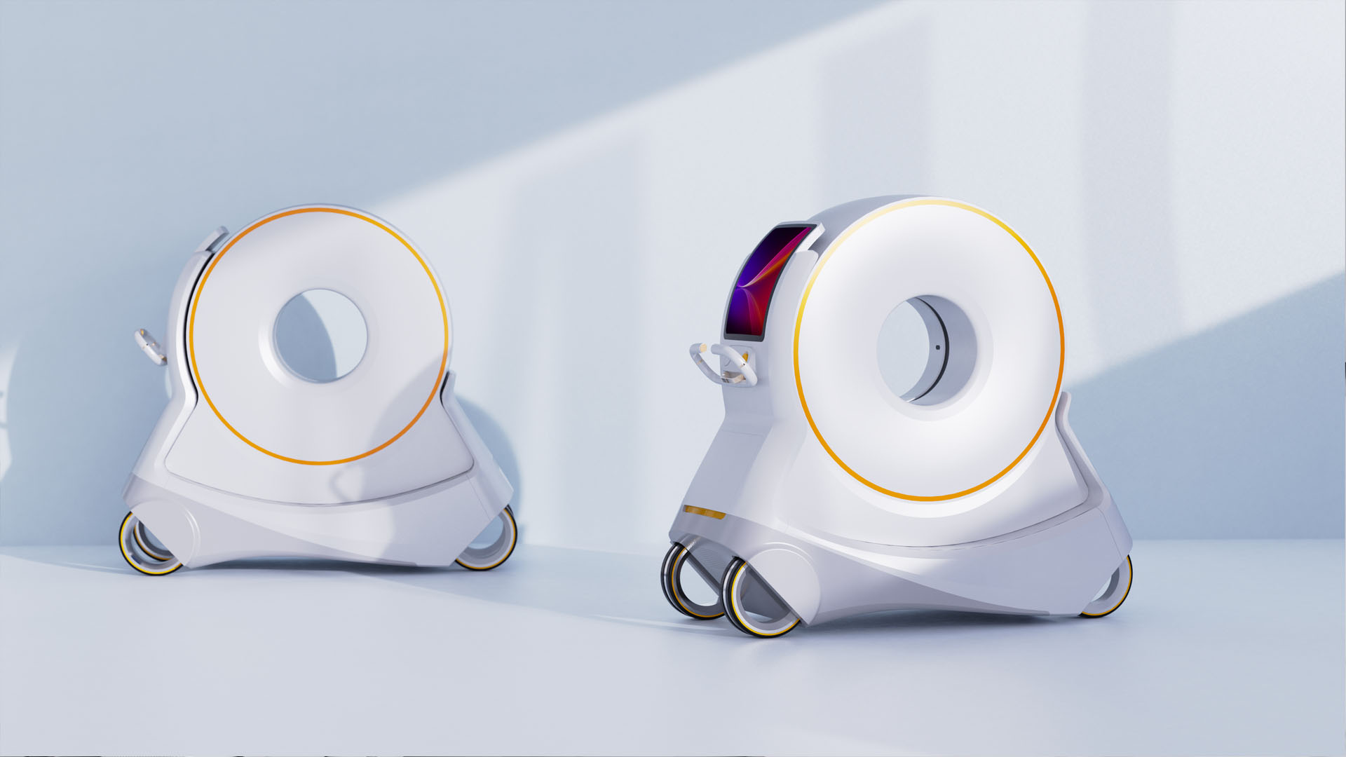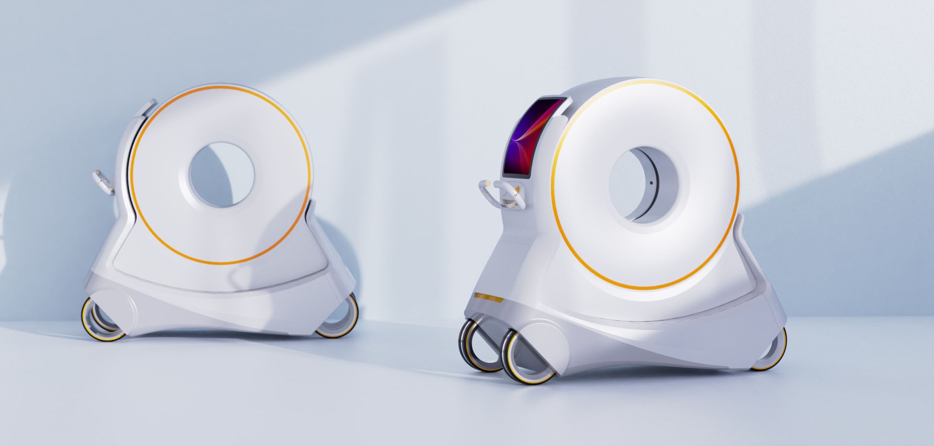 移动CT机设计,主体与车轮呈三角形设计,极强的品牌识别度,利于品牌传播。其次三角的设计营造一种稳重,用得安心的视觉印象,体现品牌对用户的人文关怀。镂空车轮设计,凸显产品未来与科技,利于提升产品的视觉价值。
